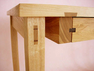 足部分は全てほぞで組み、天板反り止めの吸付き蟻桟に直接、抽斗を取り付けました。抽斗は小指1本で軽く開きます。