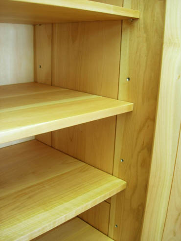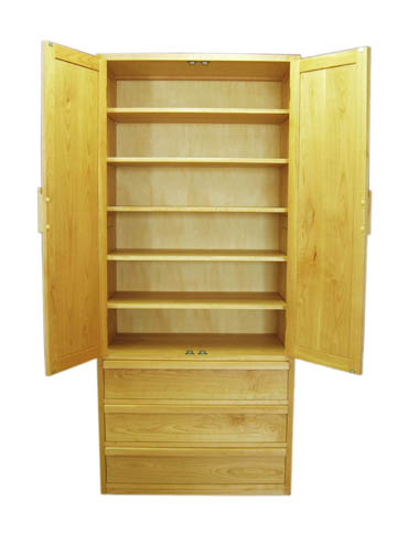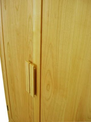 本体枠、引き出し前板、棚板、取っ手にも本桜を使用し枠内の薄板(鏡板)も突き板ではなく本桜を薄く加工してはめ込みました。